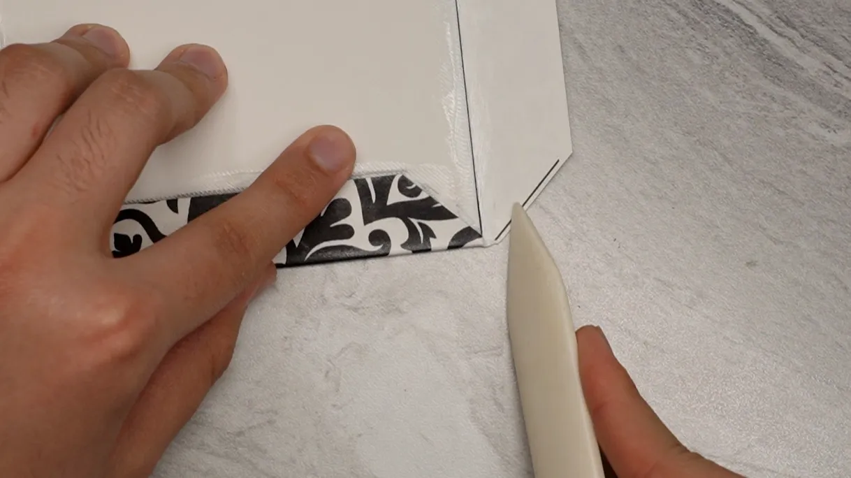 - Gently open the cover and use a bone folder or squeegee to smooth the end paper to the inside of the cover, removing any wrinkles or bubbles. Don’t open it all the way, or it might pull the sheet into the wrong position and crease it when you close it back up. You can use a sheet of wax paper under the bone folder to avoid marring the end pages.