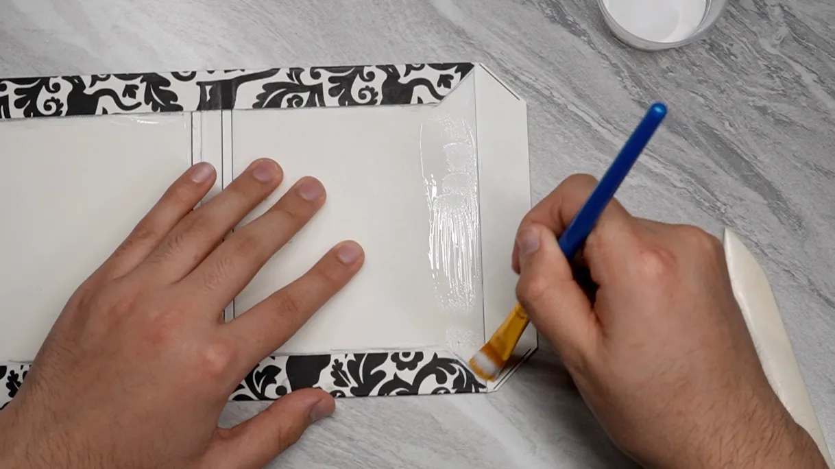 - Apply glue inside the lines where the sheet lies on the board. Re-fold and adhere the flaps firmly with the bone folder or squeegee.