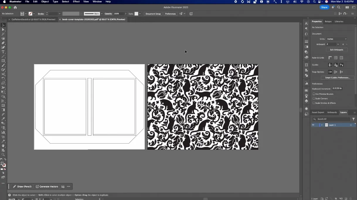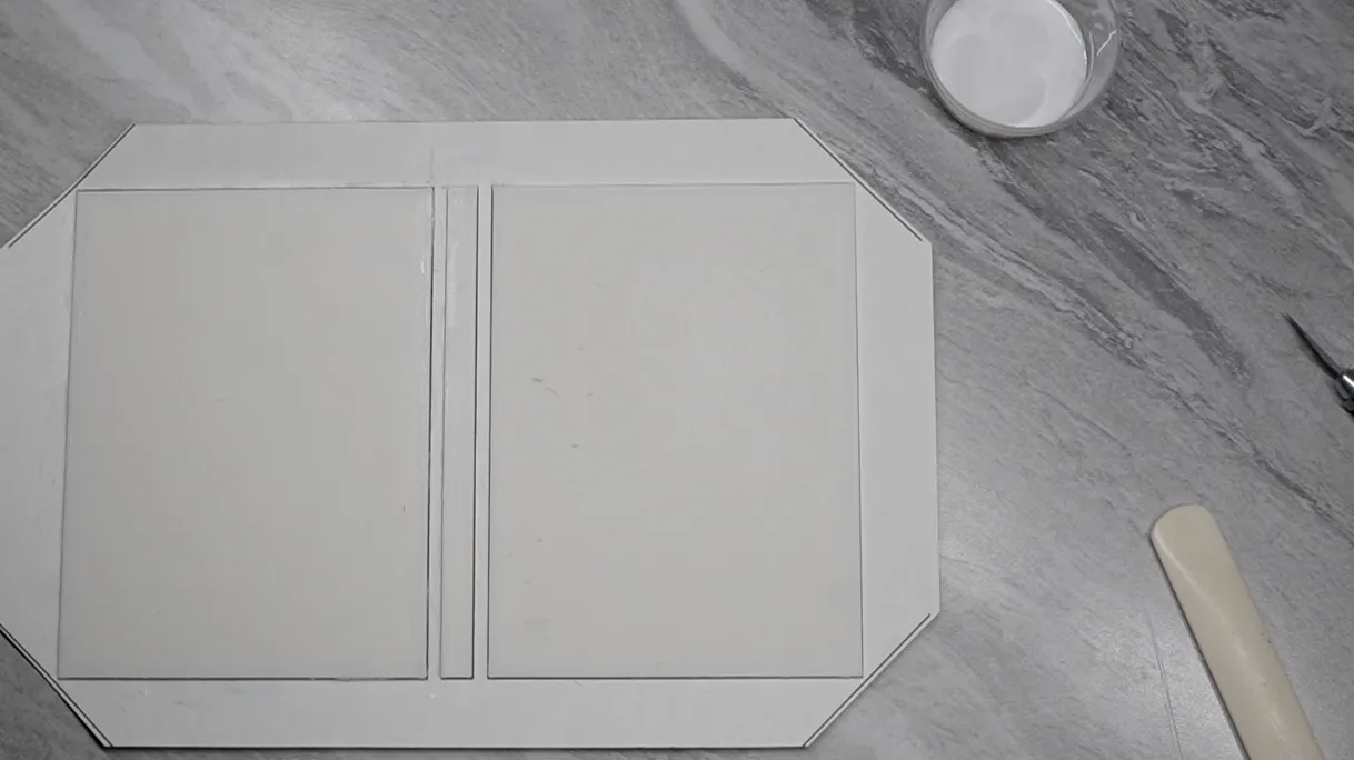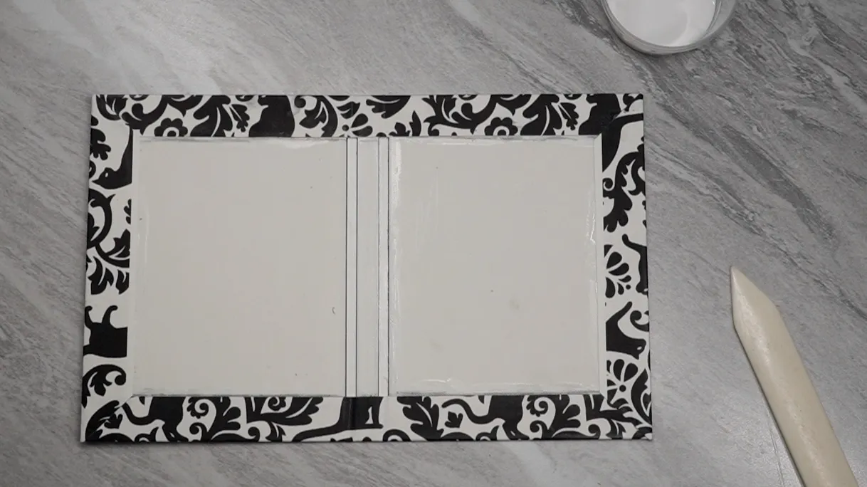 - Apply each piece to the template-side of the cover sheet inside the lines, leaving gaps between the spine and panels. Use a bone folder or squeegee to smooth out any bubbles and make sure it sticks all the way at the edges and corners.